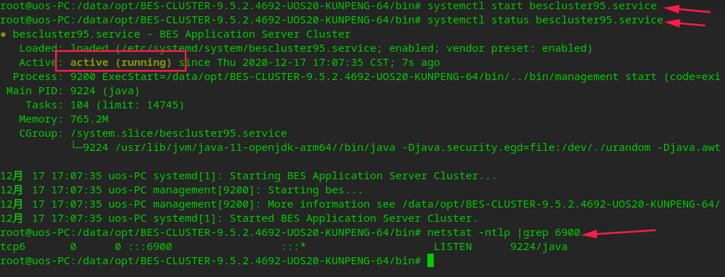 通过systemctl status bescluster95.service可以查看服务状态为active(running)