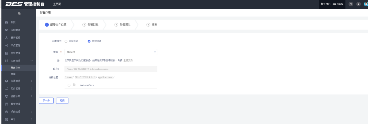 选择部署目标到右侧,应用目录选择ROOT目录位置,点击下一步