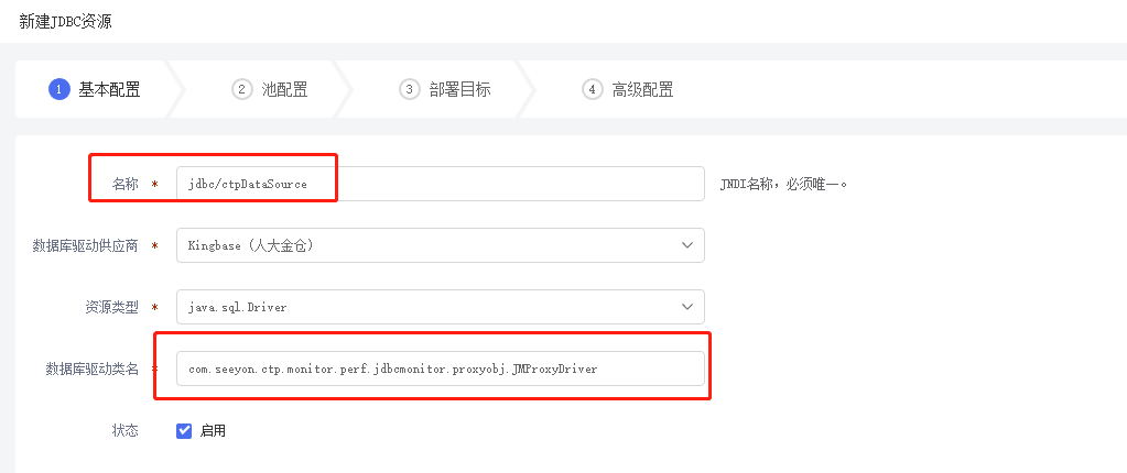 参数导航:选择资源管理-JDBC-单数据源,点击部署-新建,数据源: