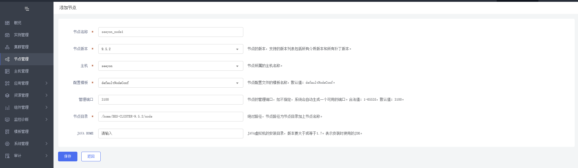录入节点信息,选择上一步录入的主机,及节点存放位置(可单独指定,当前配置是存放于BES中间件目录下)。