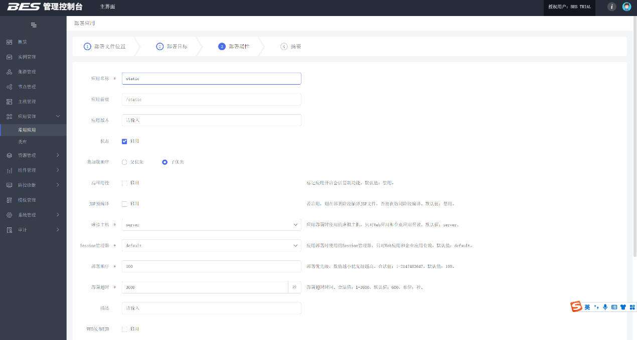 应用前缀修改为/sportal,部署顺序102 ,部署超时改为3600,点击保存开始部署。