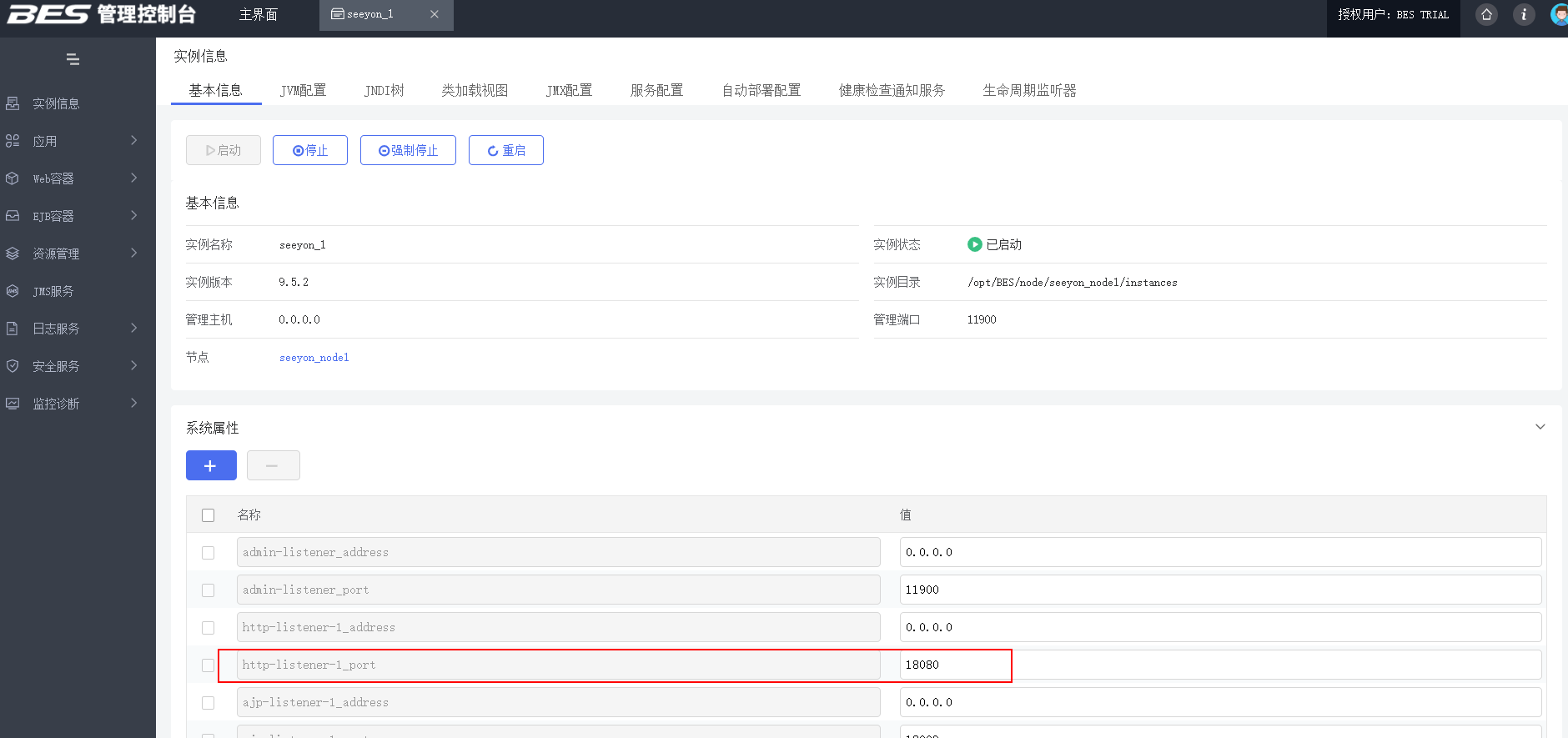 用户访问端口默认为18080,访问地址:http://中间件服务器ip:18080,可通过实例管理-基本信息-系统属性(http-listener-1_port)修改为指定端口。
