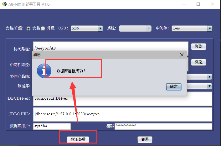 参数验证成功,提示数据库连接成功后,点击【部署】,等待提示安装成功!