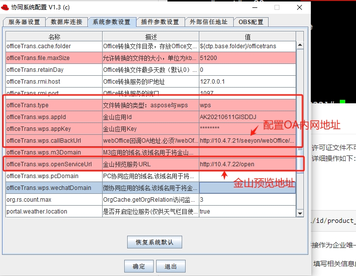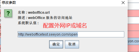 客户访问OA通过外网IP访问,包括:PC端、M3端、微协同等,其中之一。 officeTrans.wps.openServiceUrl和weboffice.url 这2个配置weboffice的外网地址(IP或域名)