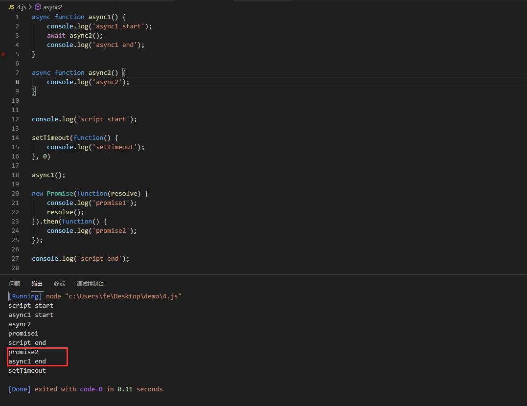 //因为 async2() 返回 promise, 所以进一步转化就是: