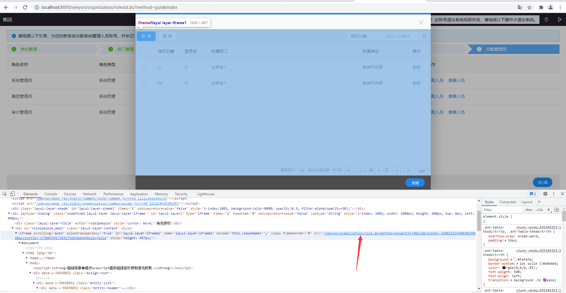 比如运行npm run dev ~-~-page:org_role_showRoleEntities角色-分配人员后,打开分配人员弹框,查看相关路径和参数
