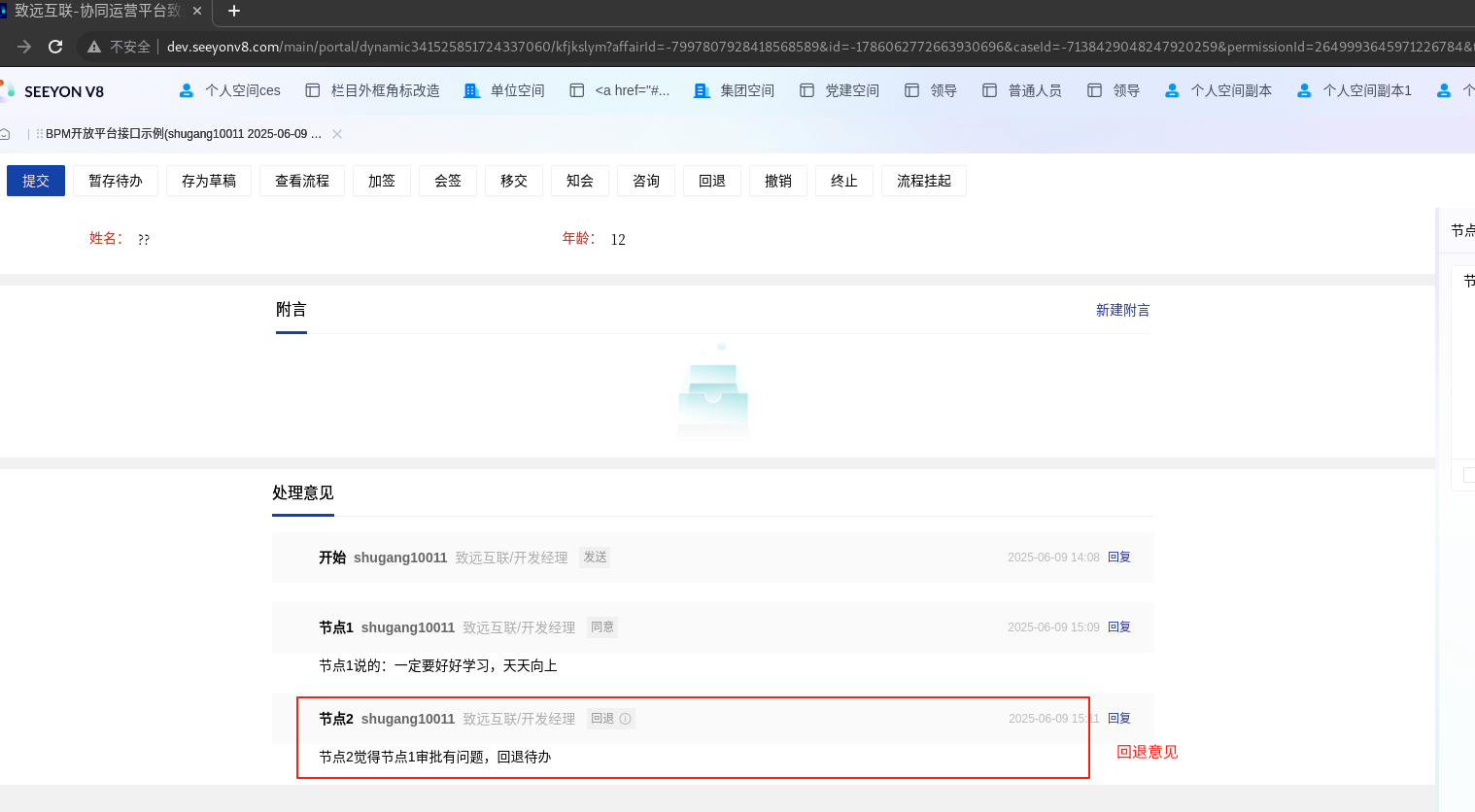 bpmCommentDto.put("content", "节点2觉得节点1审批有问题,回退待办");