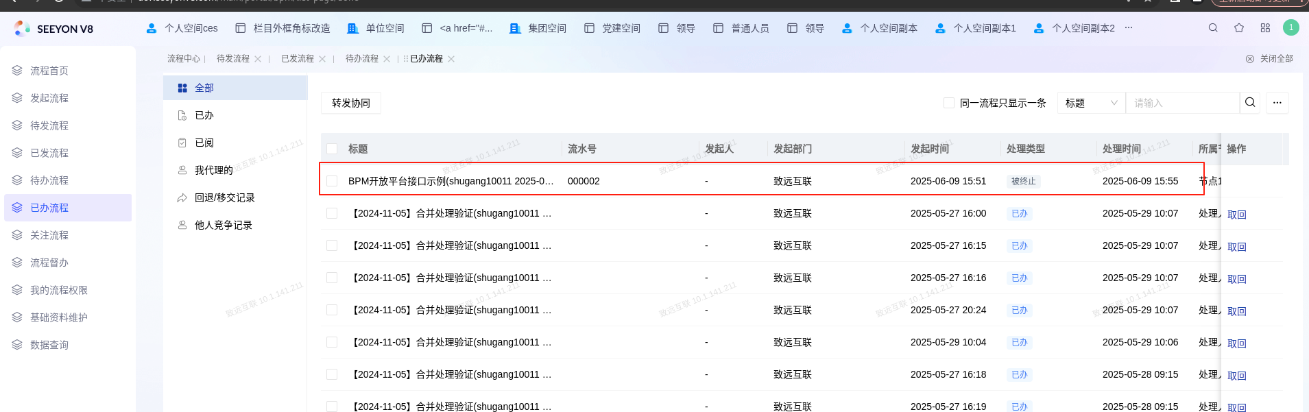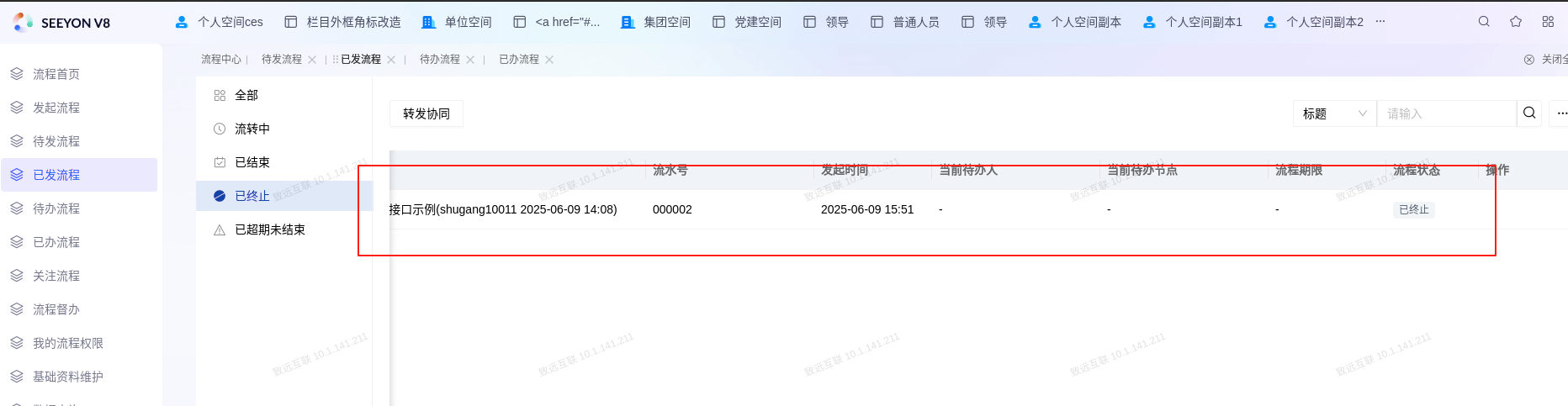 代码运行成功后,在已办、已发列表中,都可以看到终止成功的流程: