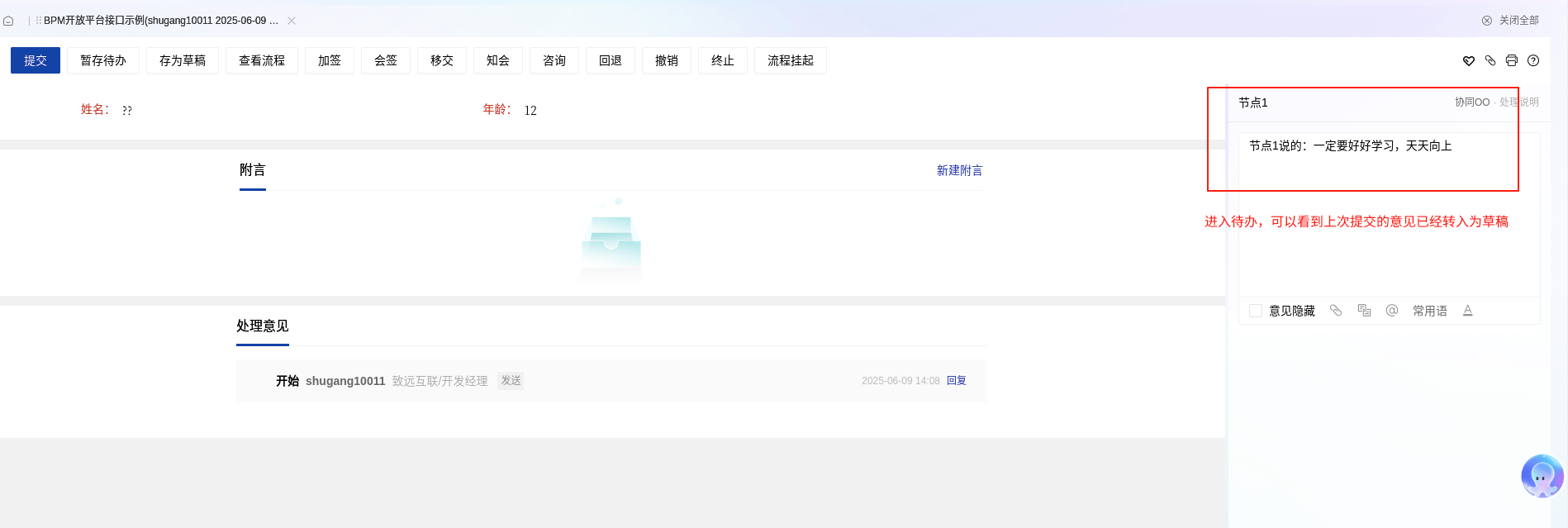 我们再次运行节点1的提交代码,由节点2回退给节点1,回退的关键参数也为事项ID(affairId)