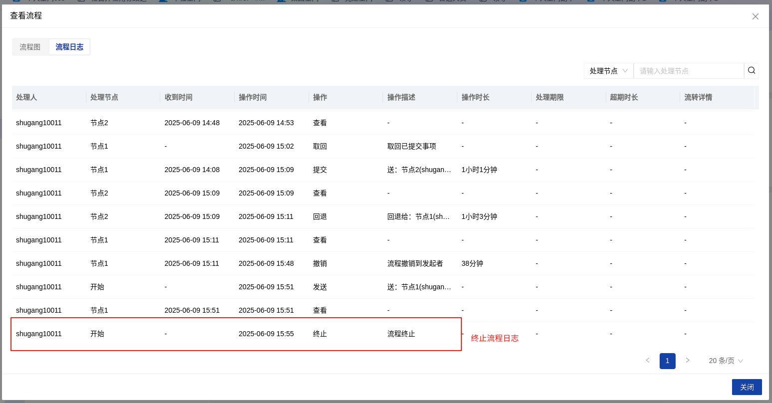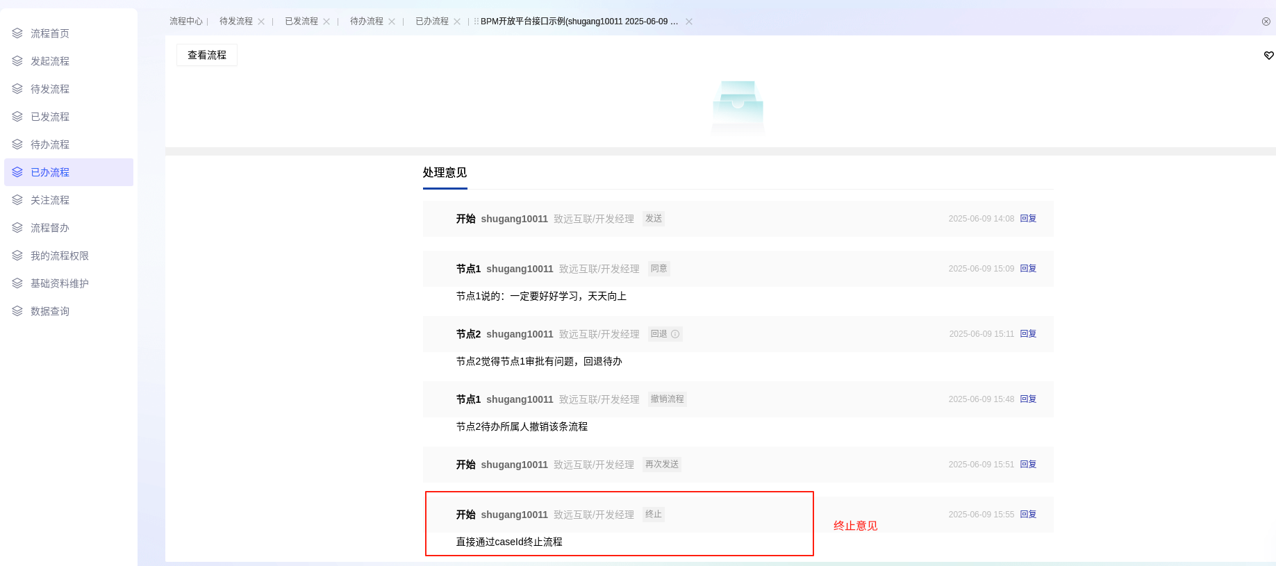 从已办详情页面进入,可以看到终止的意见、流程日志、以及当前流程终止的节点:
