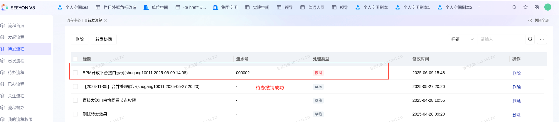 运行代码后,在待发页面会有一条撤销流程,并且该流程的所有待办都消失