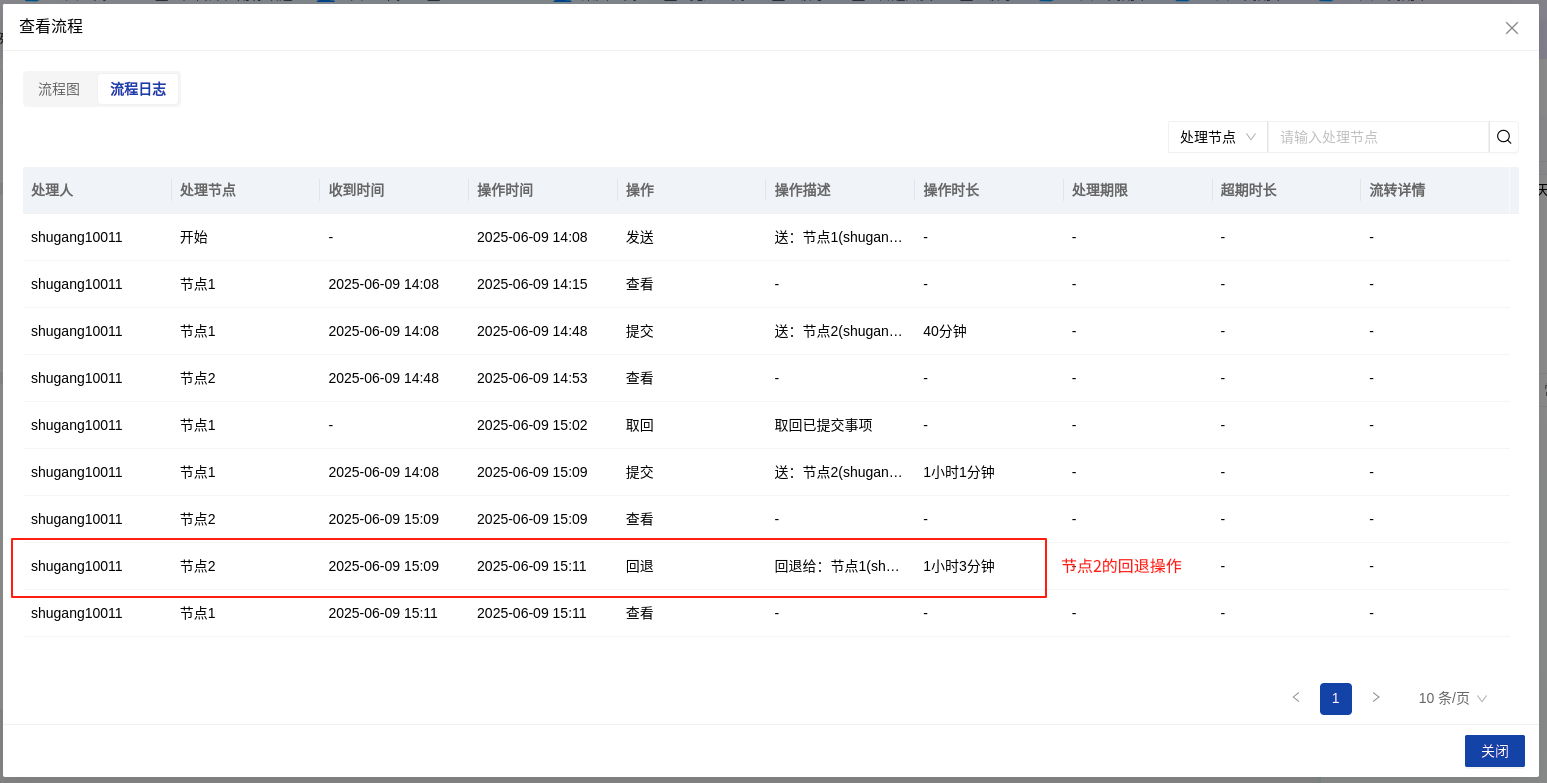 执行成功后,我们从流程日志中查看详细的流程流转日志: