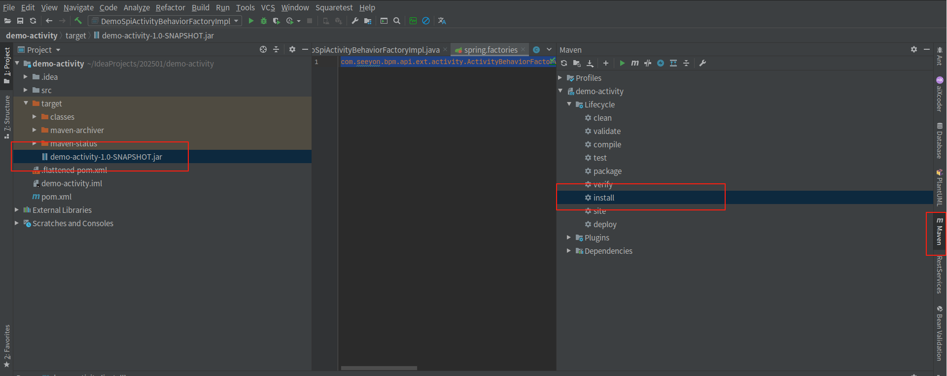 【4】定义自定义节点对应的json配置文件。 【5】依据V8平台统一的SPI集成机制,在工程目录创建resources/META-INF/spring.factories文件,并将实现的com.seeyon.bpm.api.ext.activity.ActivityBehaviorFactory=xxxx实现类加入到该文件。 【5】通过maven或者其他构建工具,对该独立功能制作成jar包。