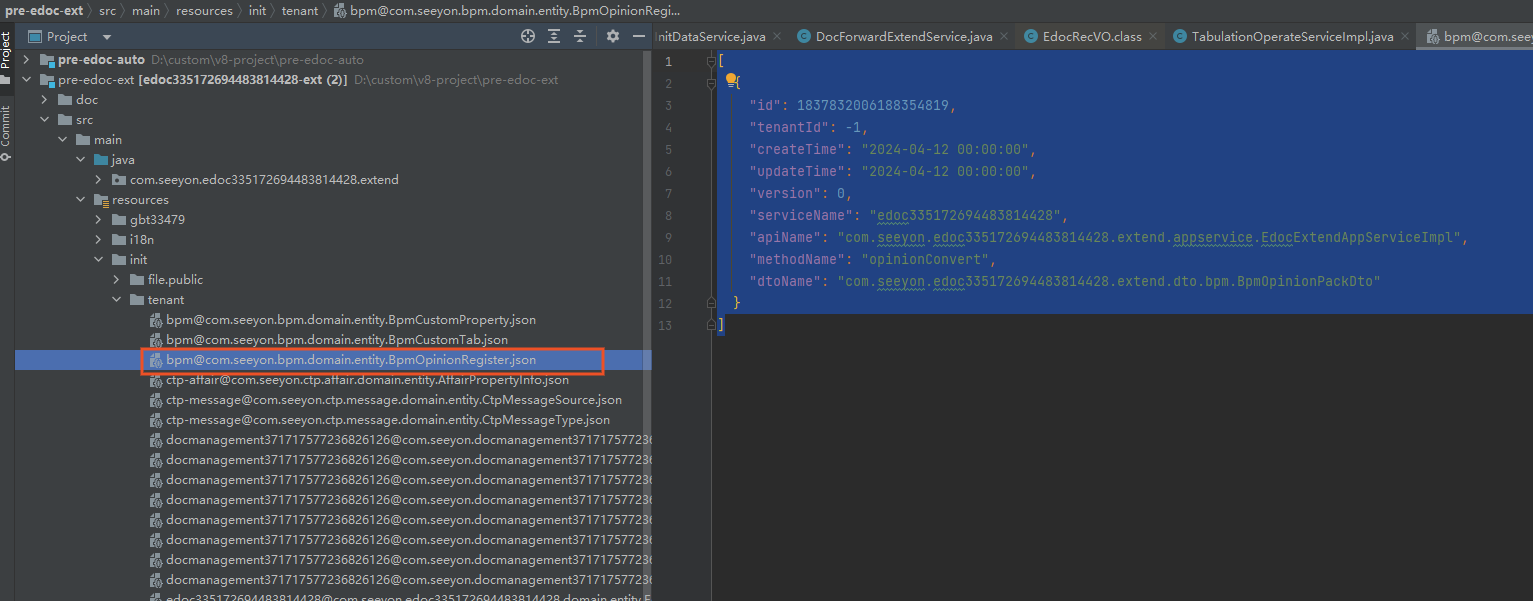 【2】通过数据初始化注册服二次渲染服务到BPM,在三方服务的resources/init/tenant/目录下创建bpm@com.seeyon.bpm.domain.entity.BpmOpinionRegister.json文件,文件中内容为需要注册的接口数据,比如公文: