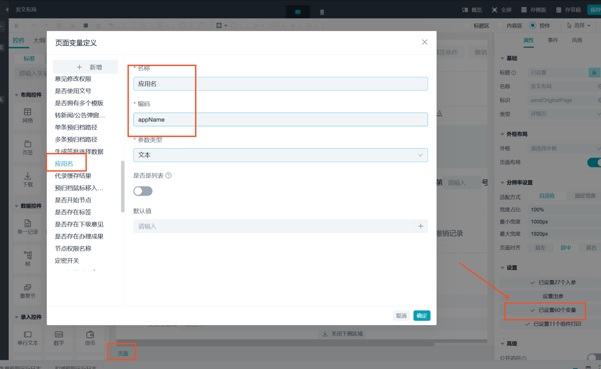 【5】在搭建应用的时候,需要在页面添加一个页面变量,名称为appName,将默认值填写成接入服务的应用名称(步骤2中json的serviceName属性),例如: