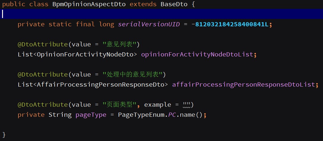 【3】注册接口入参定义的dto用于接收com.seeyon.bpm.dto.BpmOpinionAspectDto对象转换成的json数据,因此字段需要定义相同