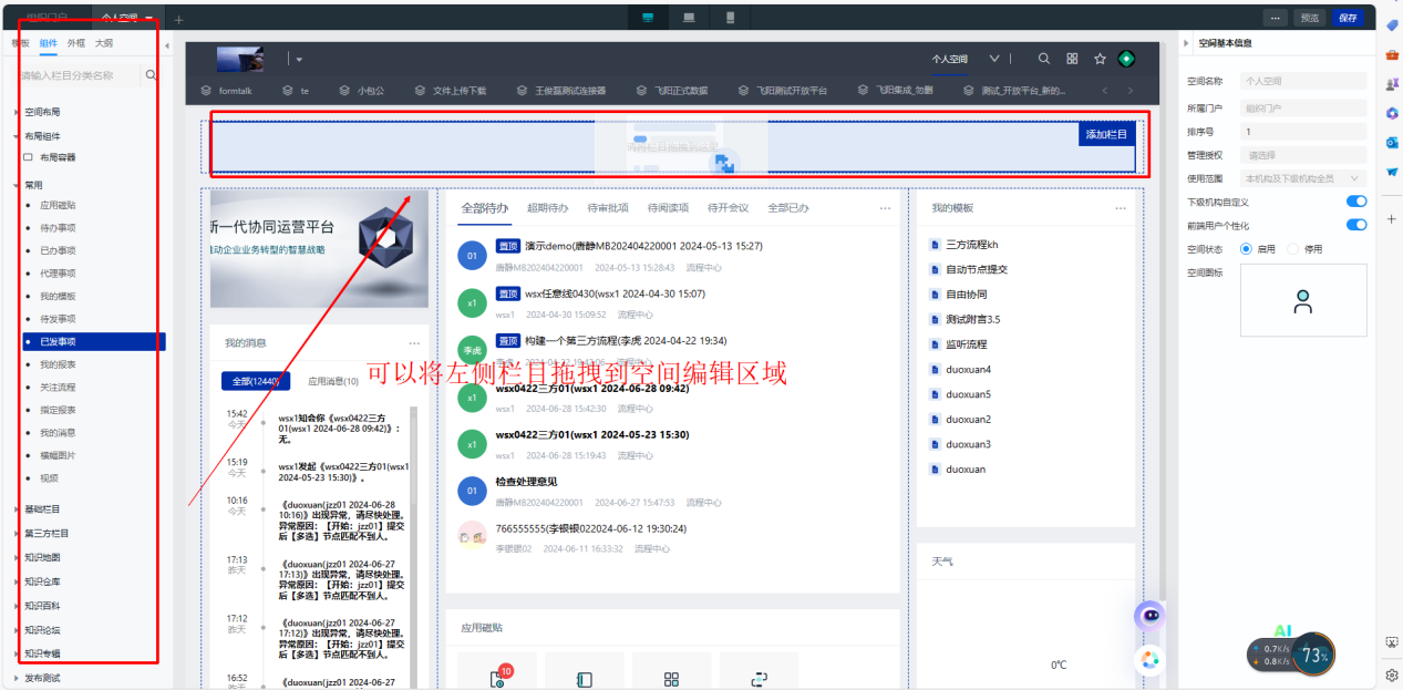 将左侧栏目组件选中拖拽到空间编辑区域,已快速实现栏目添加效果。如下图所示